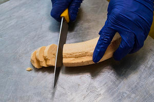 Every plantain is carefully peeled then cut to the precisely right width for the perfect cook/smash/cook outcome.